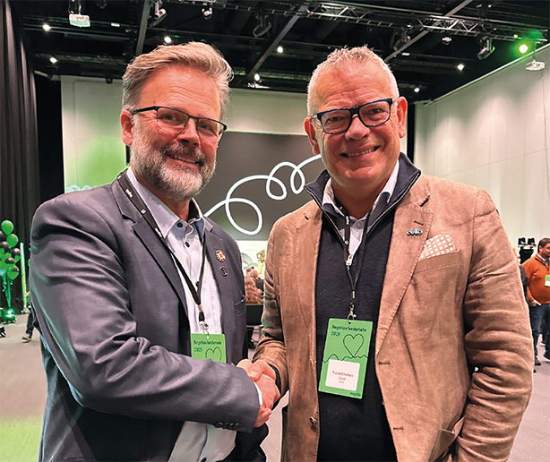 VIDERE SAMMEN. – Dette tror jeg blir veldig bra. Jeg takker hele organisasjonen for alt arbeid som er gjort i forkant, for en god debatt underveis og på landsmøtet og til slutt for vedtaket. Nå skal vi jobbe videre til beste for medlemmene, og det skal vi klare sammen, sier Negotia-leder Eirik Bornø (t.v.). Her sammen med Deltas forbundsleder Trond Ellefsen